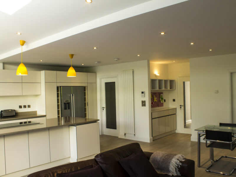 This project involved the extension and complete refurbishment of an existing house in Goatstown. The existing house was dark and segregated into small individual rooms. Some existing extensions had exacerbated this problem with the position of the utility room to the rear of the house blocking all the natural light. The clients brief was to create a new light filled kitchen, dining and living area to connect to the rear garden. After demolition of the existing poor quality 1980’s extension, the ground floor level was extended to provide additional open plan living and dining space and we reconfigured the first floor to give our clients a new master bedroom with walk in wardrobe and en-suite. The roof of the new rear extension was pitched upwards to allow light to penetrate deeper into the plan of the house creating a bright and uplifting space. A full high performance folding screen system was selected running floor to ceiling allowing most of the wall to be opened up to make a vital connection with the garden.