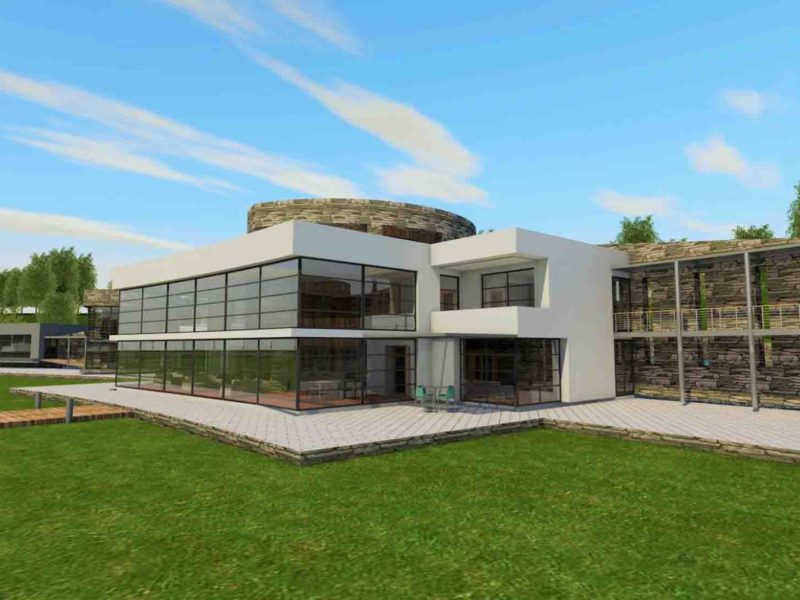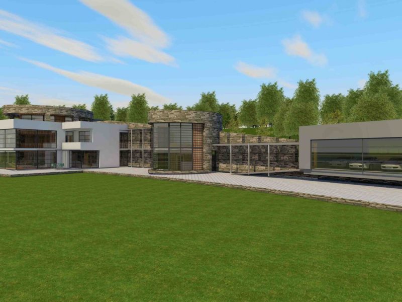 Not your typical house! The brief for this impressive house was to create a Modern Irish Castle. The house is located on a large steeply sloping south facing site overlooking the River Nore and Woodstock Estate just outside Inistioge, Co.Kilkenny. The house is designed to be a bright ultra modern contemporary house which is shielded by the stone wall to the north. Taking reference from a castle where the primary function was defence this wall offers privacy to the occupants and also reduces heat loss on the north face of the house due to the narrow slit windows. Our client also wanted a car garage to display his collection of sports cars and two guest pods which are separated from the main house.